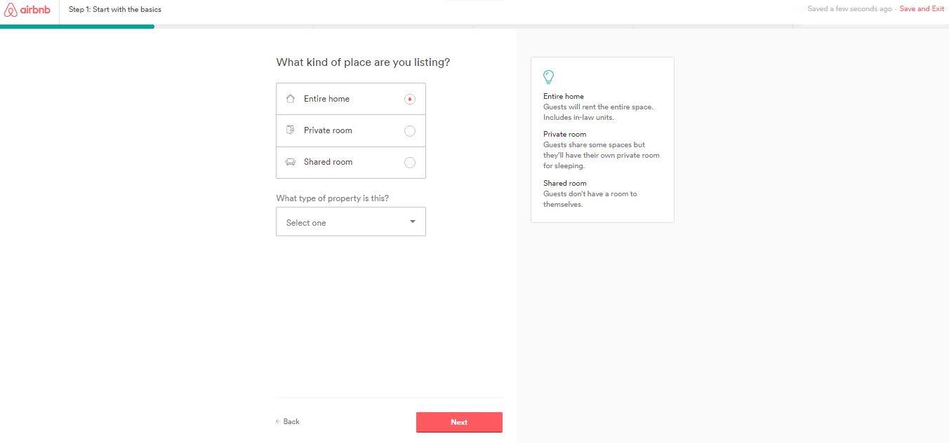 Potrebno je da čekirate o kojoj vrsti usluge tj. smeštaja se radi. Entire home - ceo apartman, kuća, vila... sa svim pomoćnim prostorijama. Ova opcija podrazumeva da gost koji iznajmi ovakav tip smeštaja, neće ga ni sa kim deliti. Private room - privatna soba, podrazumeva sobu koja se ni sa kim ne deli, ali zajedničko kupatilo i kuhinju. Shared room - podrazumeva da se soba deli sa nekim, u ovom slučaju se praktično iznajmljuju kreveti i to svaki pojedinačno. Odaberite opciju koja najviše odgovara smeštaju koji izdajete.