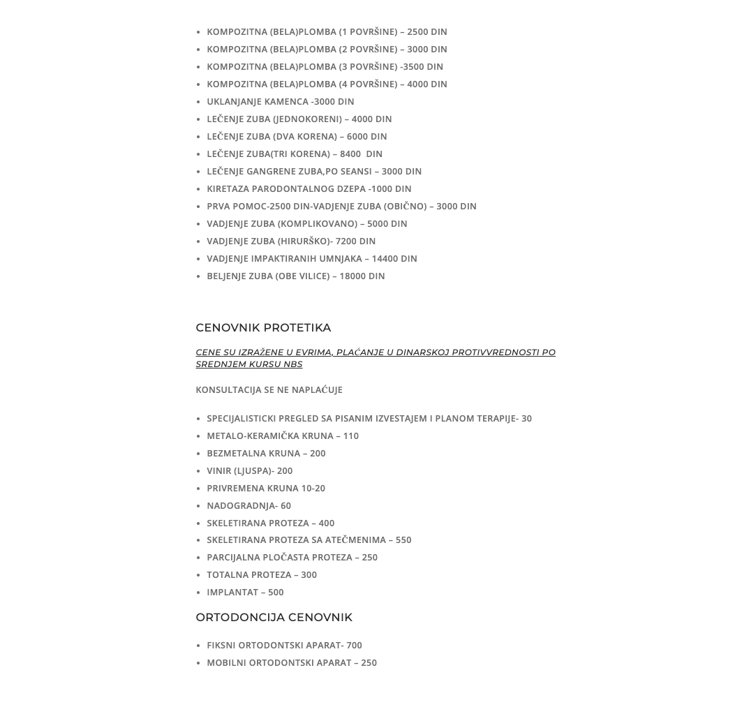 Imedijatna proteza , Parcijalna akrilatna proteza , Totalna proteza , Parcijalna skeletirana proteza , Parcijalna skeletirana proteza sa atečmenima , Direktno podlaganje proteze , Indirektno podlaganje proteze , Reparatura proteze , Privremena krunica , Kompozitni vinir , Keramički vinir , Privremeni vinir , Metalokeramička kruna , Bezmetalna kruna , Bezmetalna kruna na implantatu , Metalna keramička kruna na implantatu , Privremena kruna na implantatu , Livena nadogradnja , Fiberglas nadogradnja , Valplast Adaptna proteza , Kompozitne fasete , Keramičke fasete